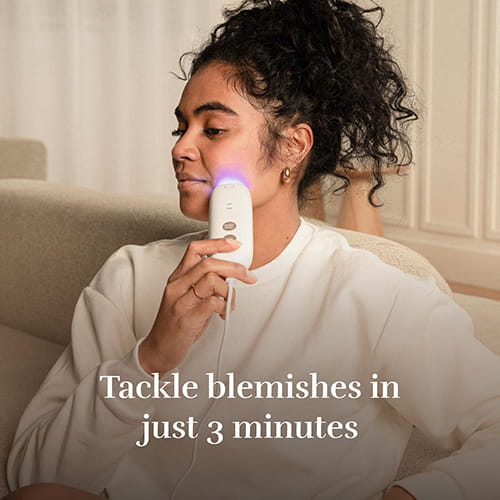 Blauw LED-licht (405 nm) in de afstandsbediening zorgt voor een gerichte behandeling van acne-gerelateerde roodheid en onzuiverheden, voor een heldere en egale teint.