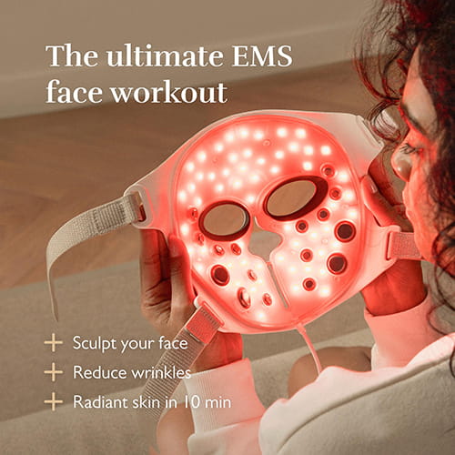 Met 16 strategisch geplaatste EMS-elektroden richt het masker zich op probleemzones zoals lachrimpeltjes, de huid onder de ogen en verslapte contouren. De verbeterde doorbloeding en verhoogde cellulaire energie zorgen voor een gezonde, gelifte glow.